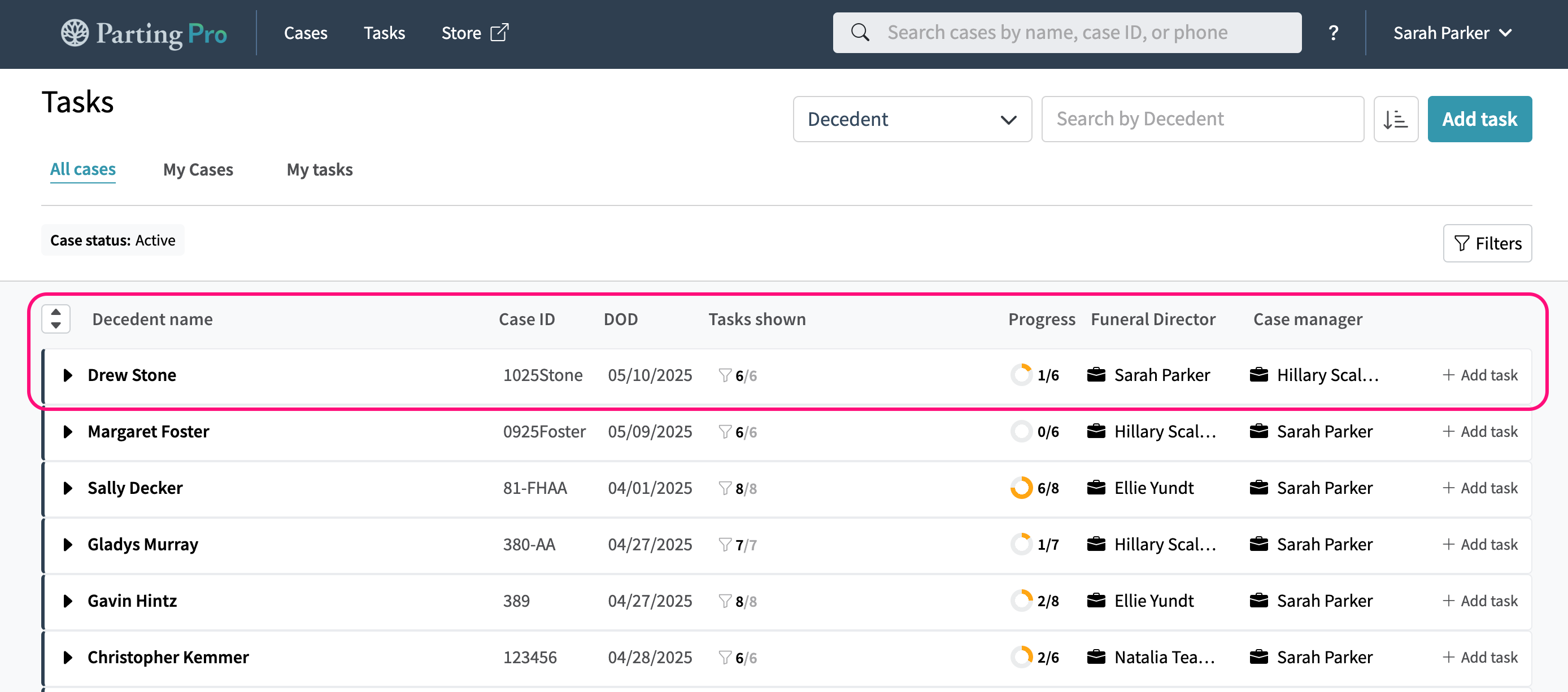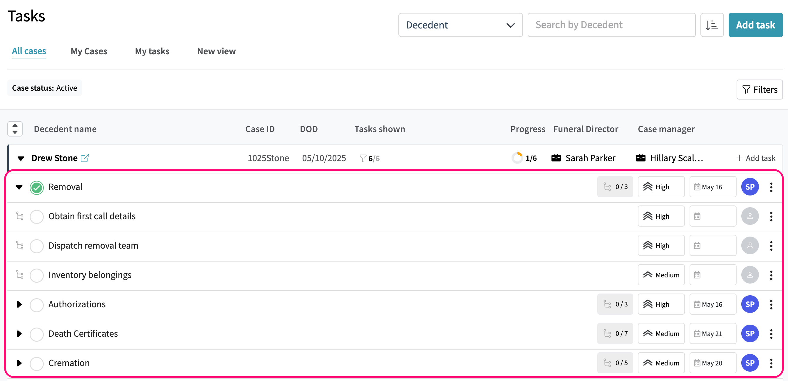 At a glance, see each decedent’s name, case ID, date of death, overall task count and progress, plus the director or manager responsible. No need to click into each case, you know instantly where things stand. And if something’s missing, you can add a task right from the same screen.